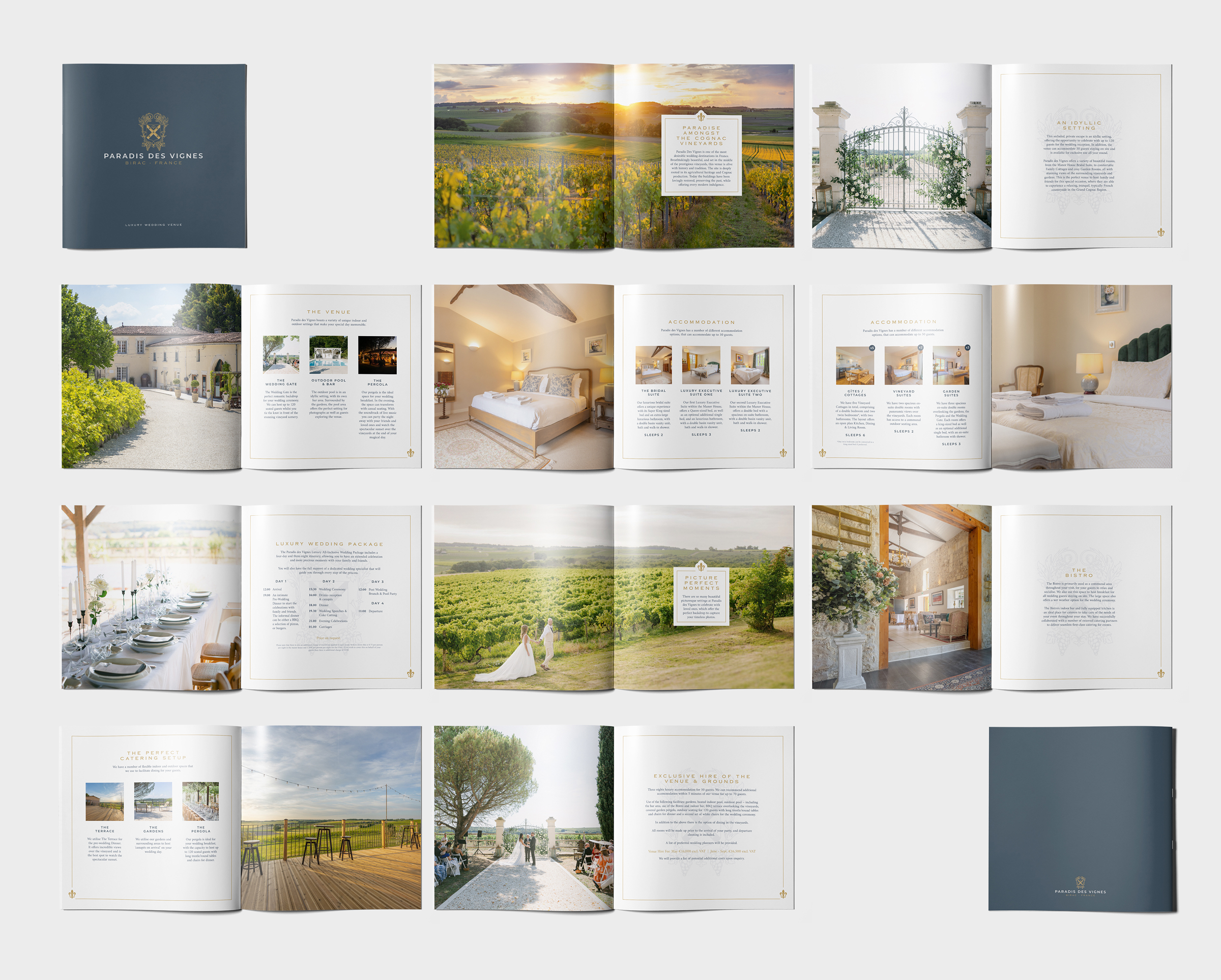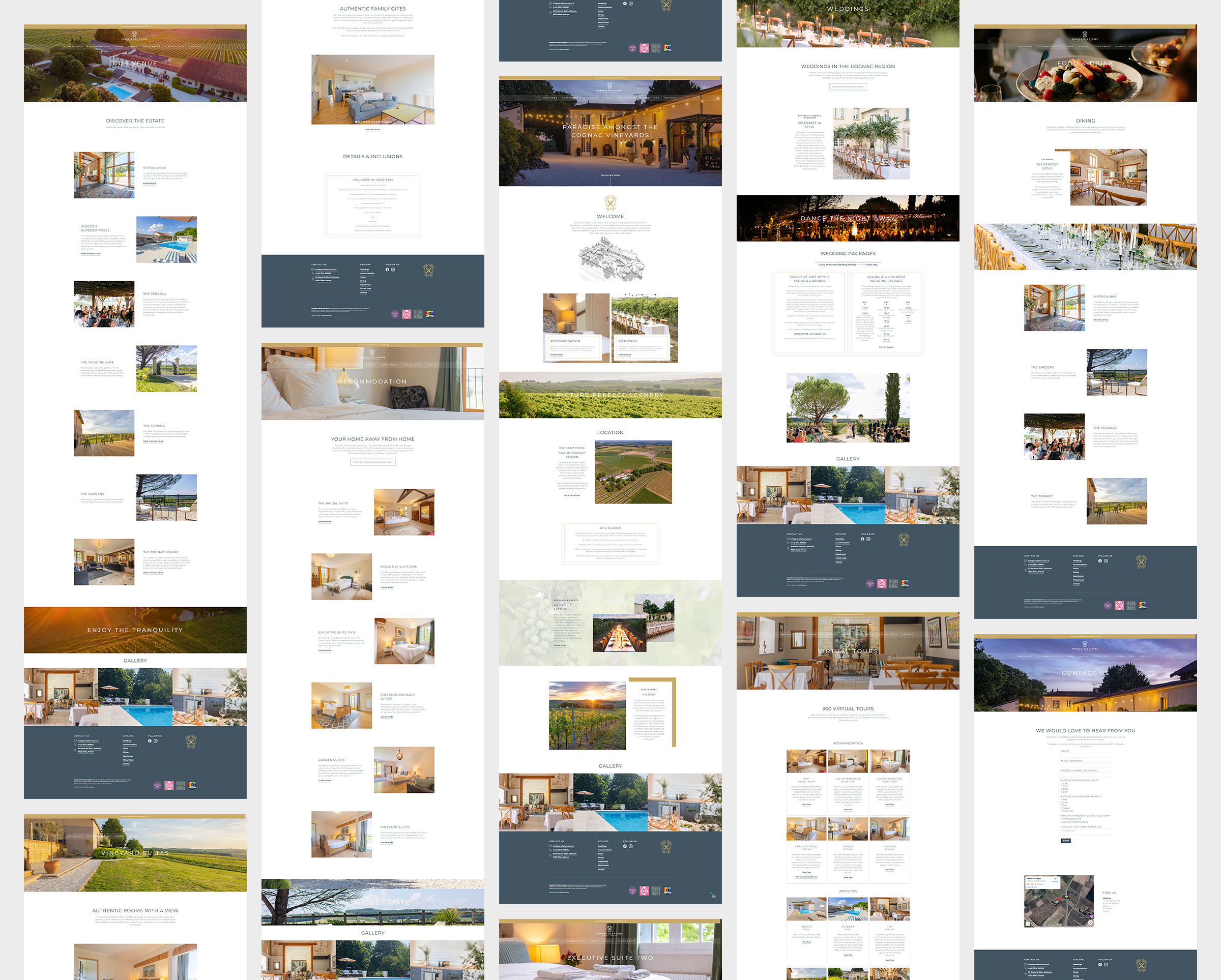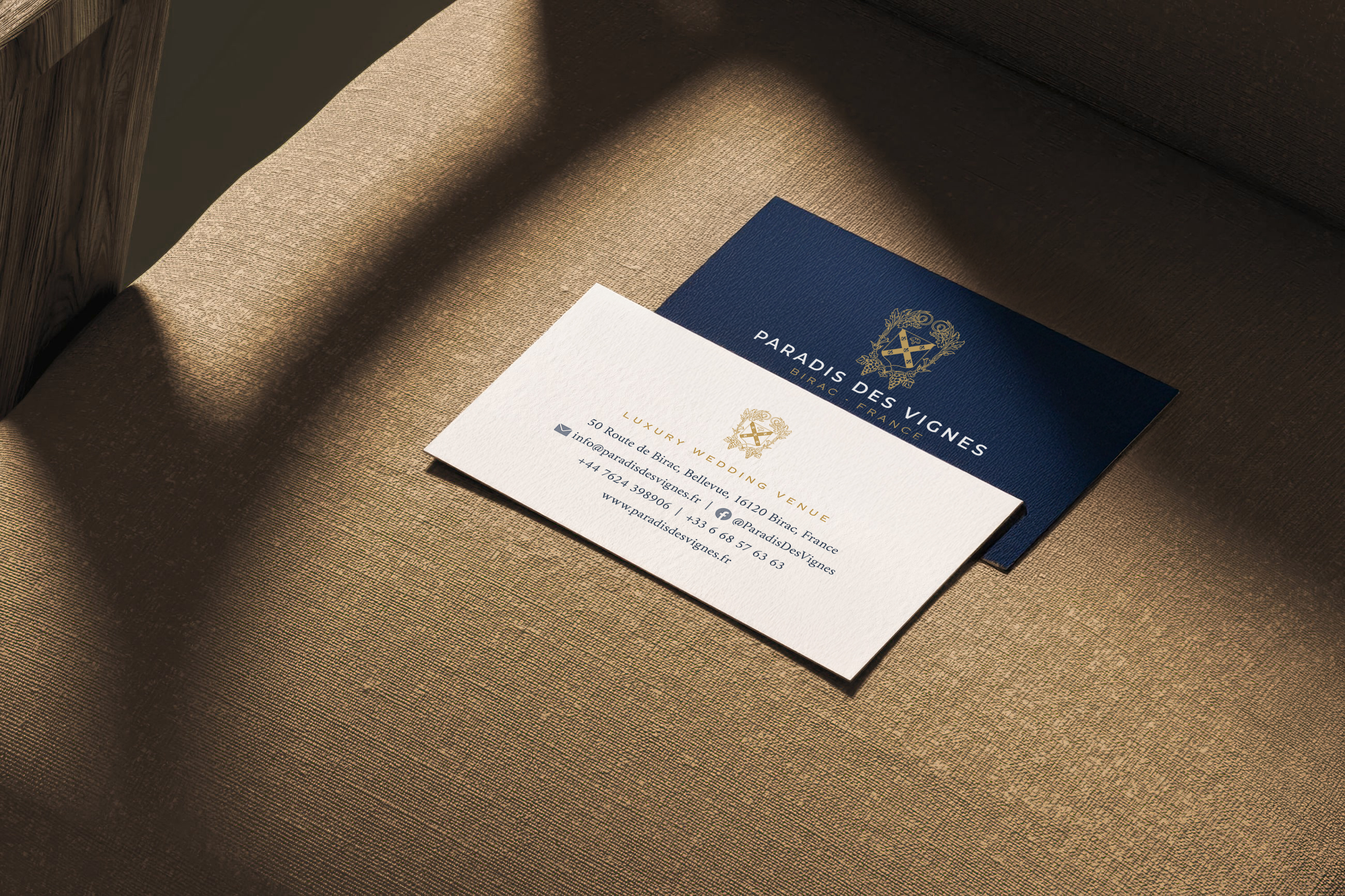 Paradis des Vignes is a luxurious wedding venue set in the heart of the Cognac region, secluded among sweeping vineyards and rich, unspoiled countryside. Defined by its elegance and sense of escape, the estate offers an idyllic setting for unforgettable celebrations.We developed a refined brand identity and website that capture the venue’s beauty, romance, and heritage. At the heart of the brand is a bespoke illustrated coat of arms, inspired by the estate’s history and its legacy in cognac production. This central motif anchors the identity, blending tradition with contemporary sophistication to reflect both the character of the estate and the timeless experience it offers.